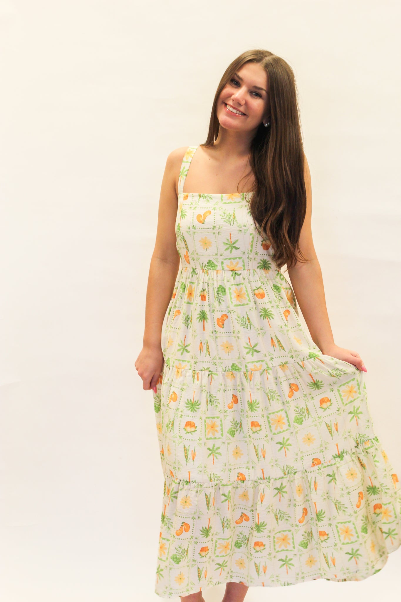 Celebrate the season in this charming Homegrown Midi Dress, featuring a delightful printed pattern of trees, fresh fruits, and vegetables that captures the essence of a spring garden. The adjustable spaghetti straps provide a comfortable, customizable fit, while the ruffled hem adds a playful touch of movement and dimension. Perfect for garden parties, farmers market outings, or any occasion calling for cheerful, nature-inspired style.