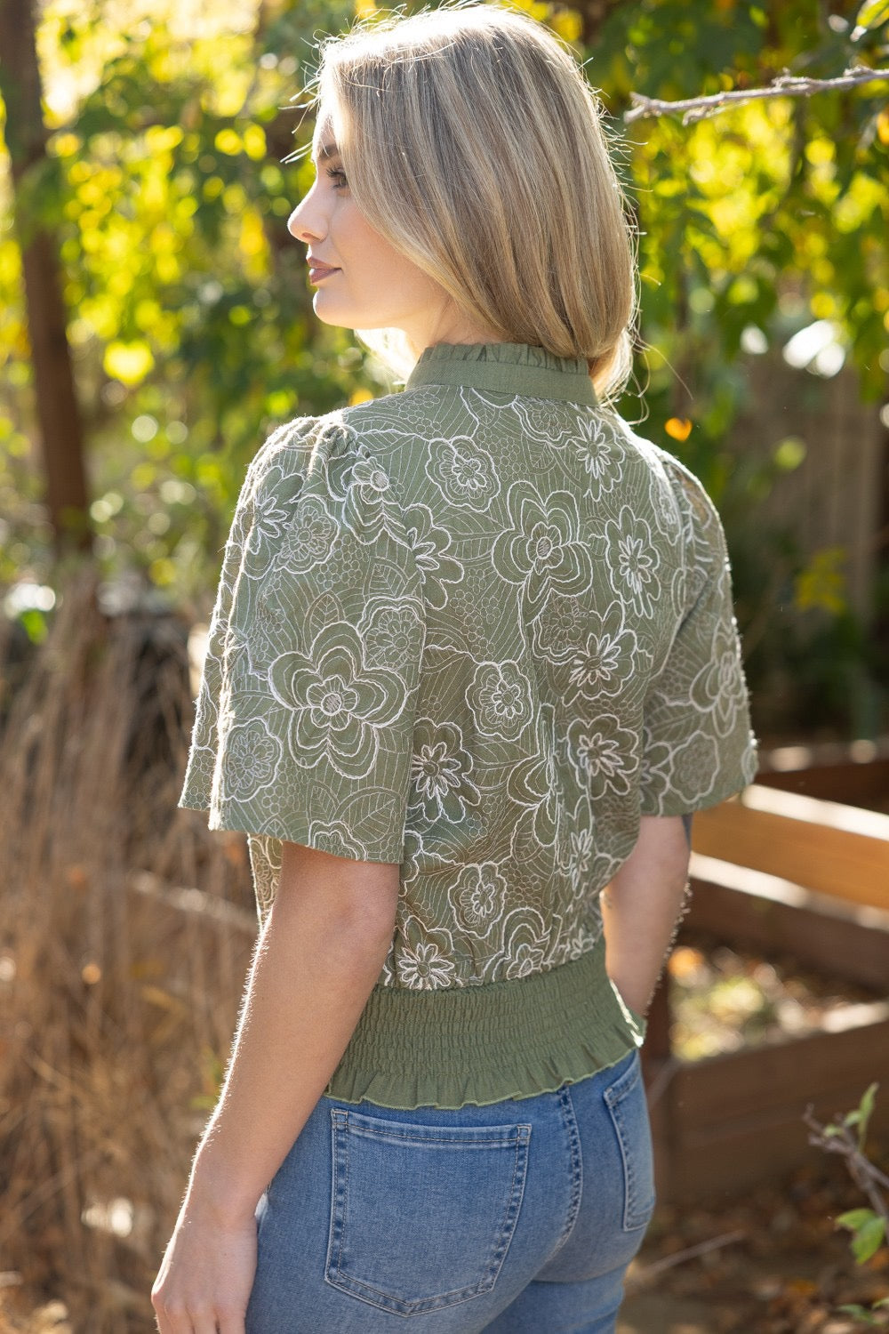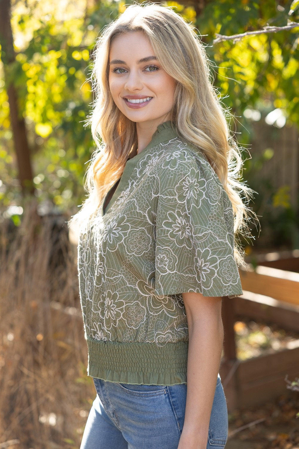 Discover effortless elegance with our Enchanted Forest Embroidered Top in soft olive green. This charming piece features delicate floral embroidery that catches the light beautifully, paired with romantic flutter sleeves and a flattering smocked hem. The gentle V-neckline adds a touch of sophistication while keeping things breezy and comfortable. Crafted from lightweight fabric, it's the perfect companion for warm-weather adventures—whether you're strolling through farmers markets or enjoying sunset gatherings. A versatile wardrobe essential that feels as lovely as it looks.