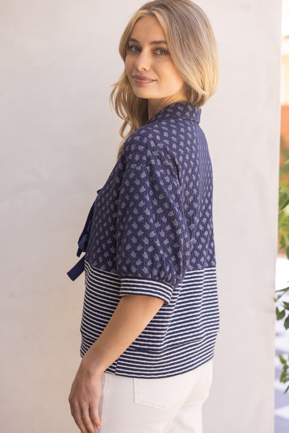 Step into autumn with the Quilted With Love Top, where cozy meets cute in playful shades of blue. Featuring a charming bow front and a collared neckline, this quilted design is the perfect weight to keep you comfy as the seasons change. It adds a sweet, stylish touch to your fall wardrobe.