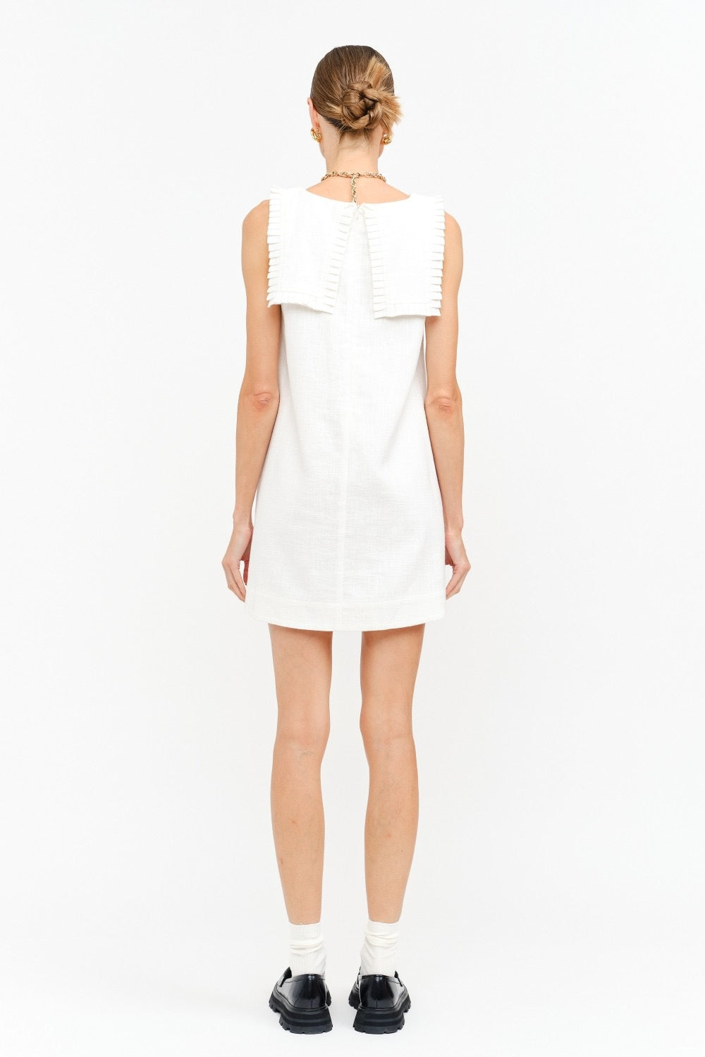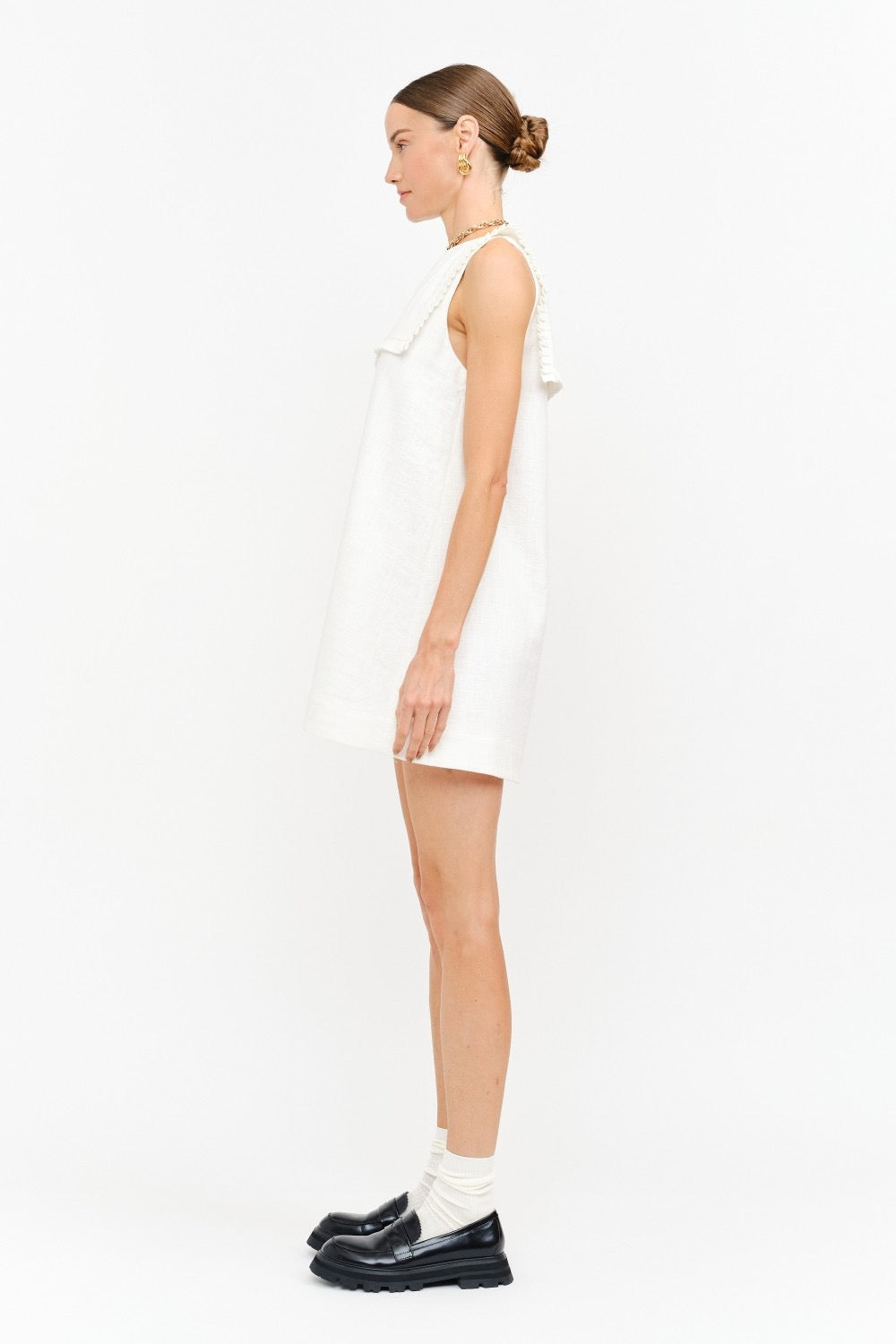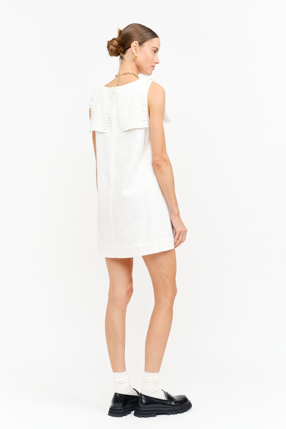 Clean and quietly charming, this linen blend mini dress keeps things polished with a crisp collar detail and an easy, swingy silhouette. Lightweight and breathable with subtle structure, it skims the body for an effortless look that works from brunch to museum days with a simple sandal swap.