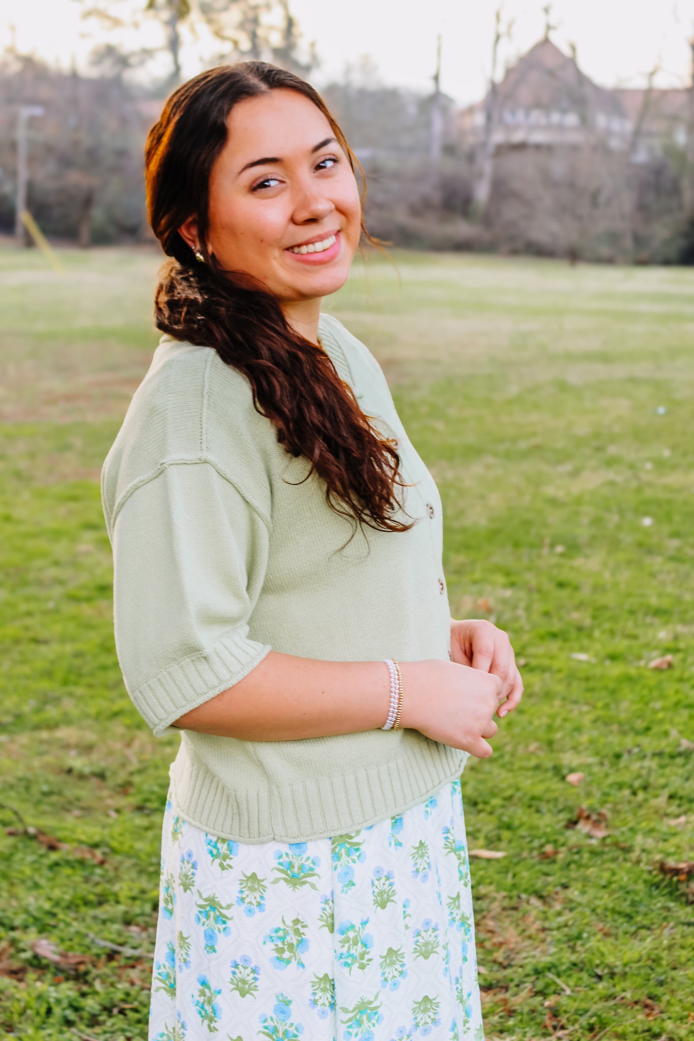 Embrace effortless cottage core, spring style with this charming light green cardigan. Crafted with a soft round neckline and finished with natural wooden buttons, it's the perfect layering piece! Slip it over your favorite sprig dress for a sweet look, or pair it with denim for casual, everyday wear. The short sleeves offer breathable comfort while maintaining that cozy cardigan appeal.