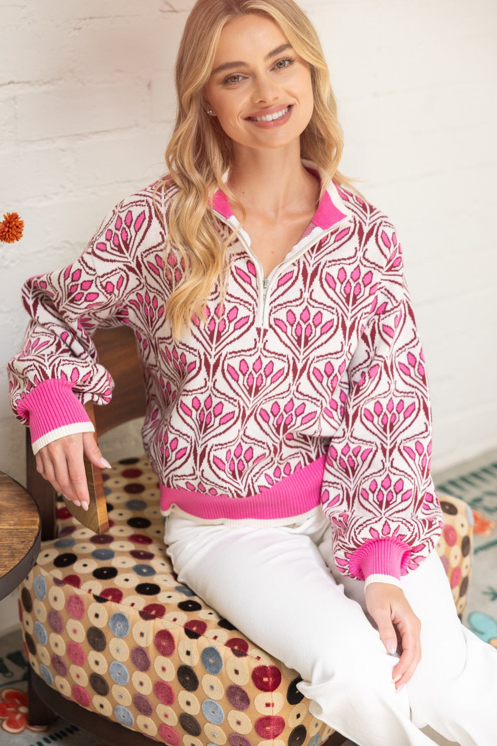Embrace cozy style this fall with the Rosewood Quarter Zip sweater top. Featuring a delicate pink floral print, this casual piece adds a feminine touch to your everyday wardrobe.