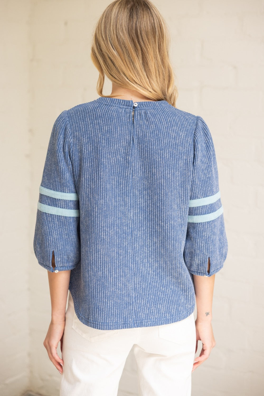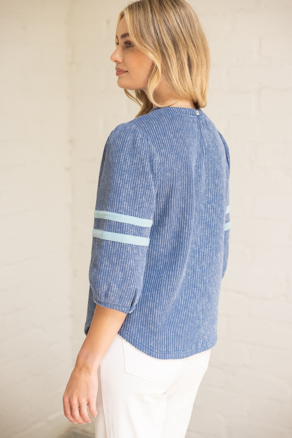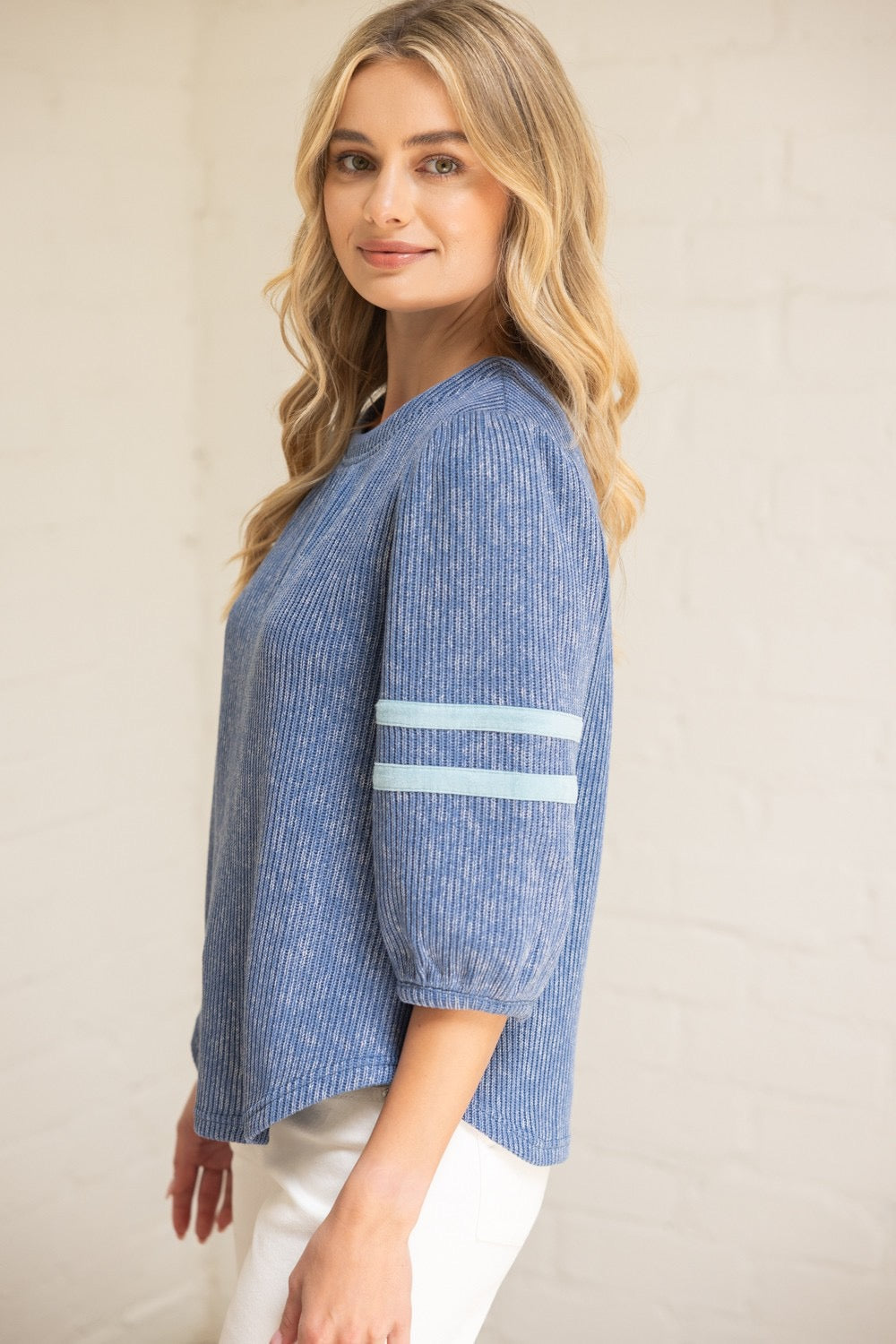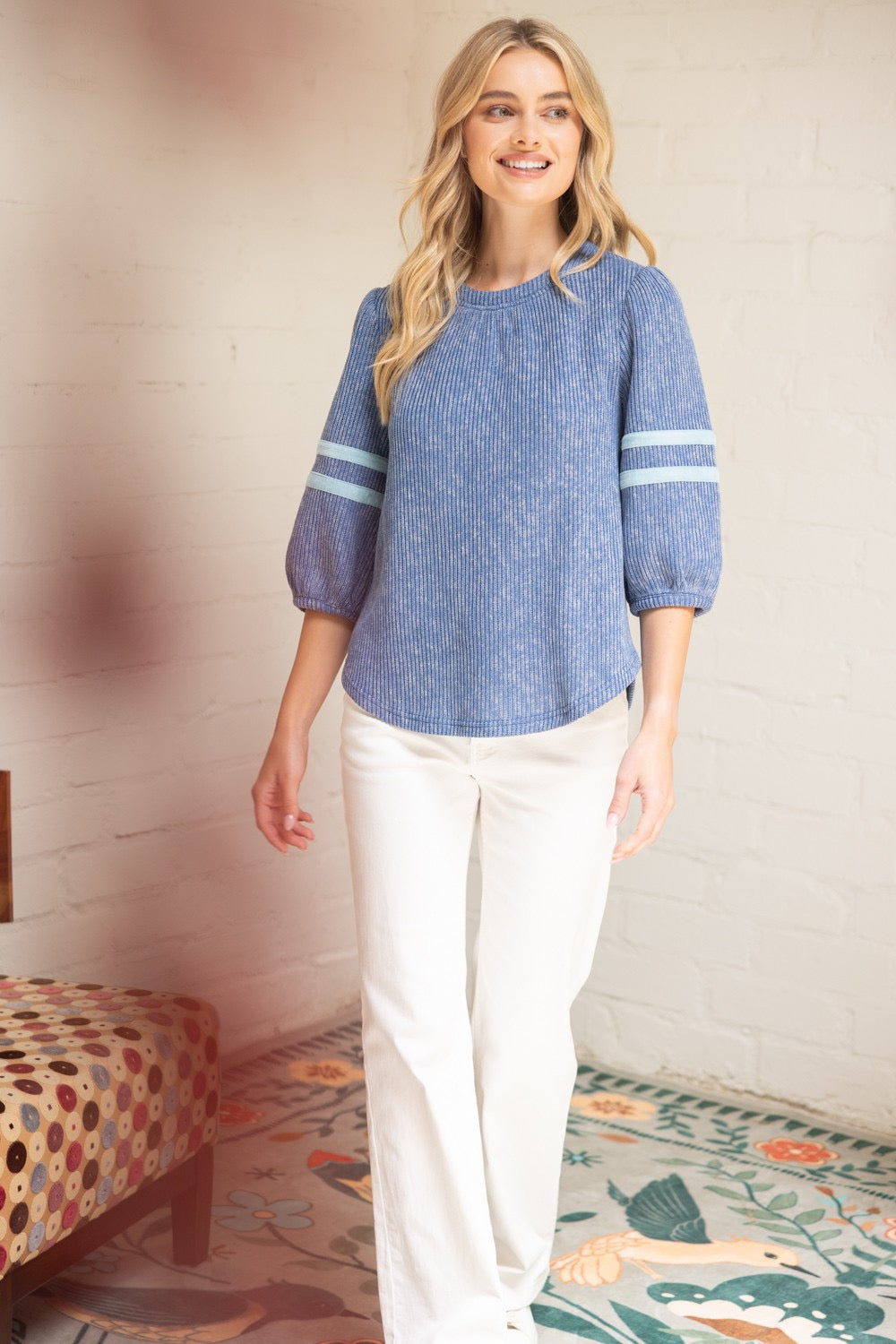 The Blue Ridge Breeze Top combines comfort and style with its soft ribbed knit fabric. Featuring half puff sleeves with subtle stripe details and a flattering rounded hemline, this casual piece is perfect for fall layering. Its relaxed fit ensures all-day comfort while adding a touch of effortless charm to your wardrobe.