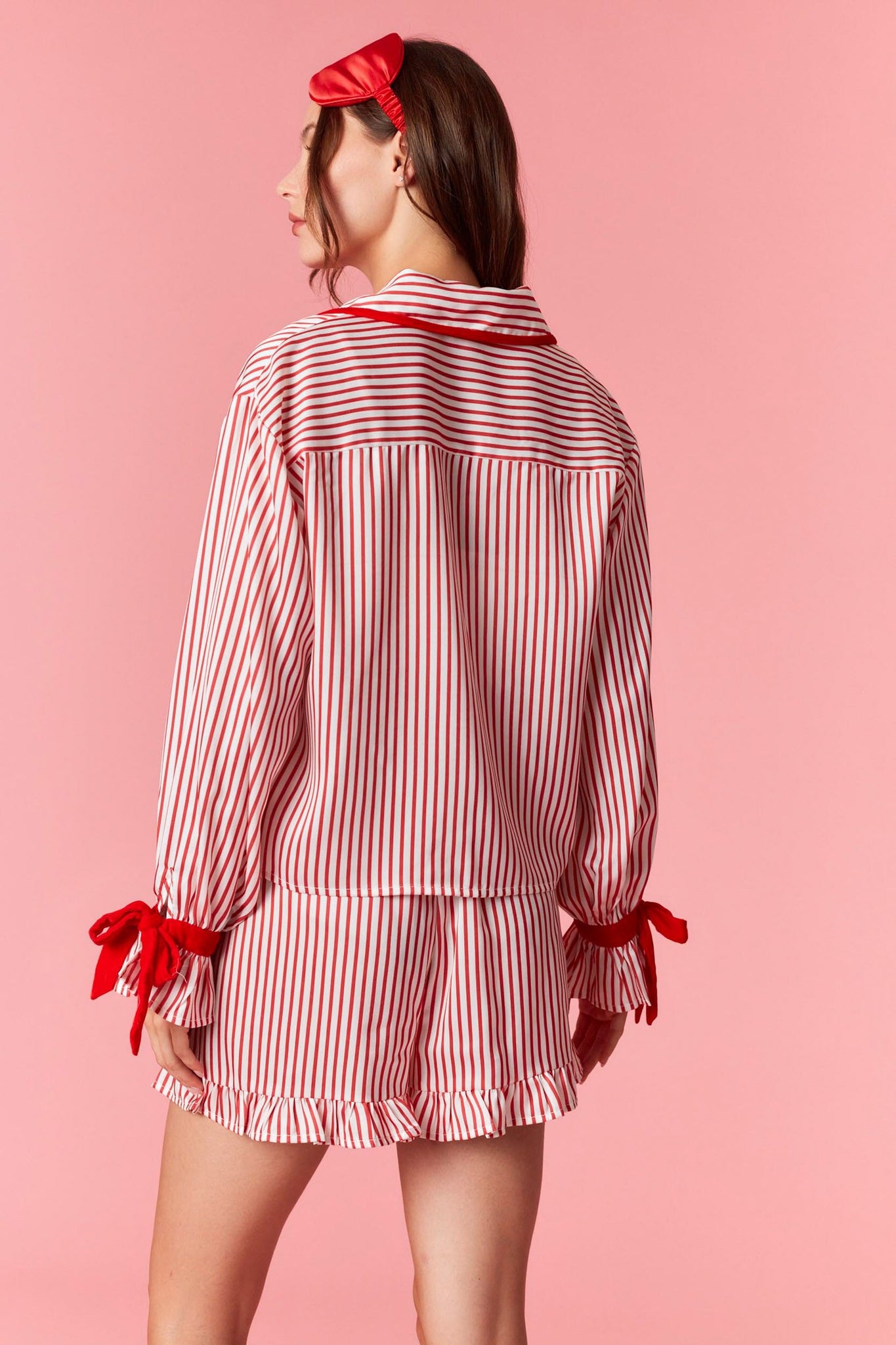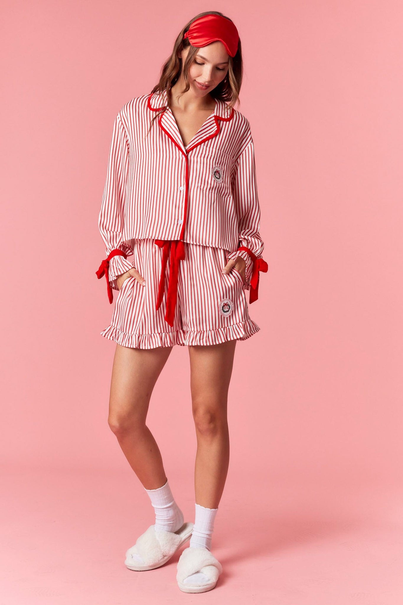 Wake up to holiday magic in this charming satin, striped PJ set! Featuring classic red and white stripes with an adorable embroidered wreath detail, this cozy two-piece includes a button-down top and matching shorts. Luxe velvet bow accents add a festive touch perfect for Christmas morning photos and lazy holiday mornings. Comfortable, and undeniably cute—the ultimate way to celebrate the season in style.